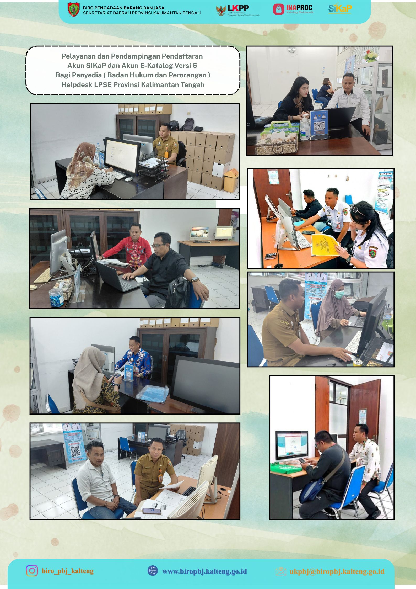HELPDESK Bagian Layanan Pengadaan Secara Elektronik ( LPSE ) Biro Pengadaan Barang dan Jasa Sekretariat Daerah Provinsi Kaimantan Tengah terus Berupaya Memberikan Kemudahan dalam Pendampingan / Konsultasi bagi Penyedia ( Badan Usaha ataupun Perorangan ) untuk Mendapatkan Informasi Pengadaan Secara Elektronik salah satunya Pendaftaran Baru Akun Penyedia Melalui Aplikasi SIKaP maupun Melalui Katalog Elektronik Versi 6.